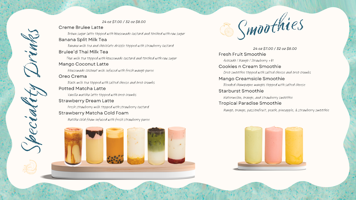 A drink for nostalgia lovers! Banana milk tea and chocolate drizzle topped with strawberry custard *No creamer adjustments available for this drink*